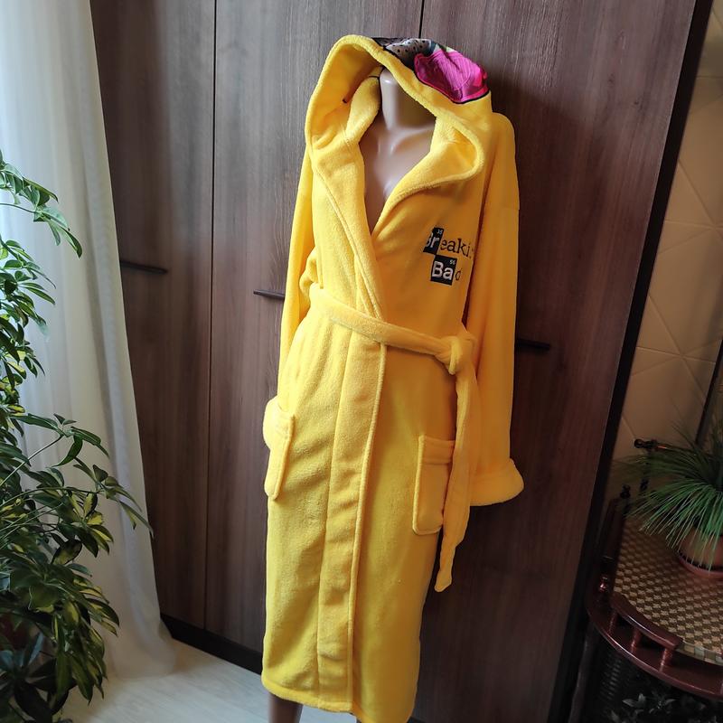 Новый халат без бумажной этикетки, его цвет и дизайн связаны с известным сериалом "Пуститься берегу" очень качественная ткань- теплая, м * мягкая, пушистая, идеальный пошив., капюшон с яркой аппликацией - вид стильный! ПОГ-60 длина- рукав-115