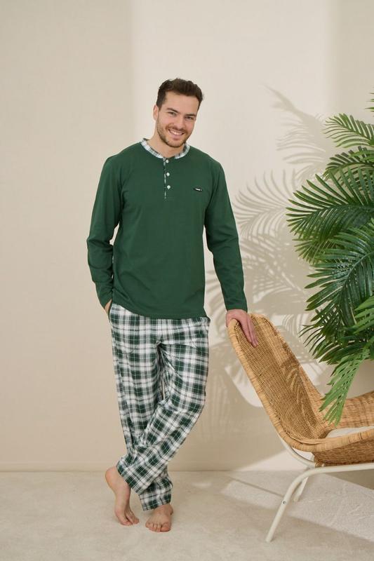 Мужская хлопковая пижама "Cameron" лонгслив и штаны Этот мужской пижамный комплект из хлопка – настоящее воплощение комфорта и элегантности. Изготовлен из мягкой и приятной к телу хлопковой ткани, он обеспечивает удобство и позволяет почувствовать себя комфортно в любое время суток. Комплект включает: Лонгслив на пуговицах – классический элемент дизайна, что добавляет элегантности и универсальности. Мягкий хлопок дарит приятное ощущение в течение всего дня или ночи. Брюки в клетку – стильный акцент на классическую тематику, удобный крой и мягкий пояс, не стесняющий движений. Этот пижамный комплект идеально подходит для спокойных вечеров дома или для комфортного сна. Вы будете чувствовать себя в нем не только удобно, но и стильно. арт. PJ6300-8 (серый) арт. PJ6300-1(зелений) Размер: M-L-XL-2XL