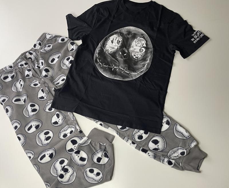 Розмір М Піжама чоловіча (підліткова) за мотивами фільму Діснея Тіма Бертона «Кошмар перед Різдвом». Футболка: чорна, короткі рукави. На ньому зображено обличчя головного героя Джека Скеллінгтона, схоже на повний місяць. Штани: Довгі, сірі, з еластичним поясом. Вся поверхня містить повторювані відбитки облич і черепів Джека Скеллінгтона. Матеріал: футболка трикотажна, штани теплі плюшеві.