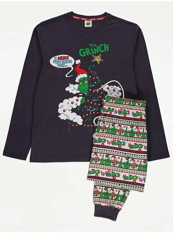 Розмір М Комплект різдвяної піжами з принтом Грінча. Комплект складається з футболки з довгими рукавами і брюк. Футболка сірого кольору із зображенням Грінча і написами «I MUST FIND SOME WAY TO STOP CHRISTMAS FROM COMING» (Я повинен знайти спосіб зупинити Різдво) і «HE HAD SOME AWFUL AWFUL IDEA» (У нього була жахлива, жахлива ідея). Штани мають яскравий візерунок із зображеннями Грінча, смужками та різдвяними мотивами. Це одяг на тематику популярного персонажа Грінча, викрадача Різдва. Чудово підходить для створення святкового настрою та комфортного відпочинку в зимові свята.