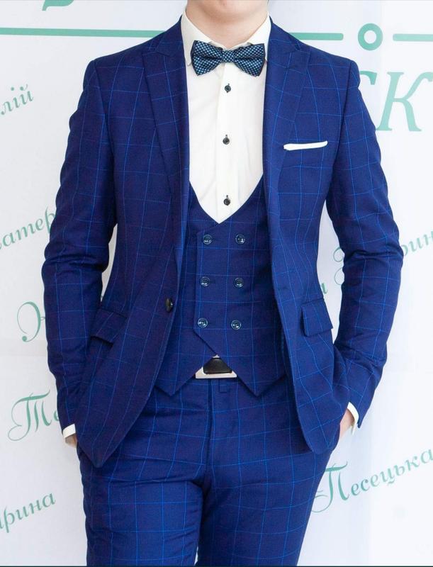 Костюм мужской EMIR. 48 размер. Пиджак приталенный, посадка средняя. Ярко-синего цвета, в клетку. В идеальном состоянии, надевался 1 раз. К нему можно добавить рубашку цвета айворе на запонках. Замеры: Пиджак: плечи-43см, рукав от плеча - 64см, пог - 49 см, длина - 71 см Брюки: длина - 103см, шаговый шов - 80см, ПО талии - 43, ширина штанины внизу - 20 см