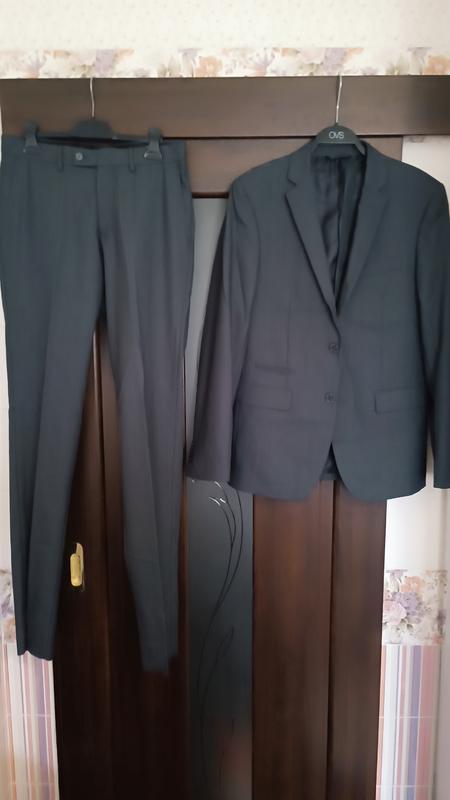 Размер указан 46. Состояние нового. Пиджак: длина 74, ПОГ 44-46, рукав 66, плечи 44. Штаны: длина 115 ещё не подшиты, ПОТ 40, ПОБ 47, посадка 24.