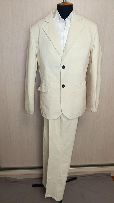 льняной костюм в состоянии новой вещи нюансов нет. карманы по бокам пиджака, есть нагрудный карман и петлица в лацкане. брюки классические. с боковыми карманами и карманами сзади. бирок кроме размера М - нет. длина пиджака 71см длина рукава 64см плечи 46см ПОГ 55см ПОТ пиджака 51см ПОТ брюк 47см длина брюк 107см длина шагового шва 79см