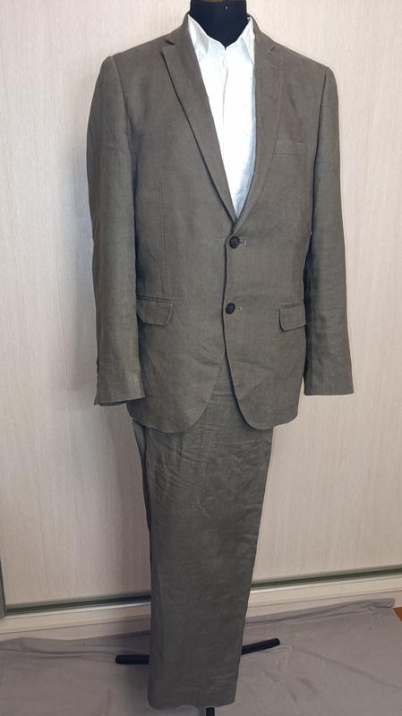 льняной костюм в идеальном состоянии нюансов нет. карманы по бокам пиджака, есть нагрудный карман и петлица в лацкане. брюки классические. с боковыми карманами и карманами сзади. длина пиджака 75см длина рукава 65см плечи 45см ПОГ 55см ПОТ пиджака 49.5см ПОТ брюк 46см длина брюк 107см длина шагового шва 80см