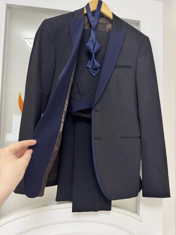 Чоловічий костюм Zara man ( піджак, штани, метелик) чорного кольору з синіми вставками, дуже стильно виглядає. Стан ідеальний, вдягнутий пару раз Штани розмір 31, піджак 38 Коштував значно дорожче, є фірмовий чохол