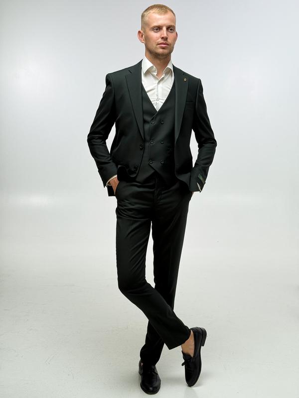 Классический темно-зеленый мужской костюм тройка приталенный (46)