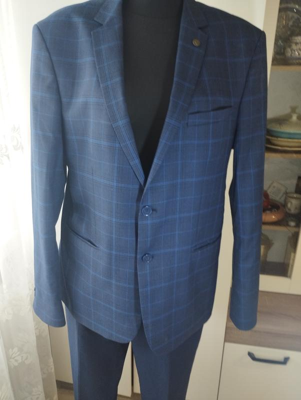 красивый костюм синего цвета,пиджак в голубую клетку. очень качественная ткань, красиво держит форму. 80% шерсть,20% вискоза. в составе ткани вискоза, через это не мнется. дефектов нет. одевался на высокого мужчину 190 см роста. длина брюк и рукавов не менялась, не вшивалась. качественные лекала. красиво сидит по фигуре. пуговицы можно перешить по мере необходимости ( тут не вшивалось ничего) на бирке размер 56, по факту маломерит на 54, смотрите замеры пиджак: -длина 76 см -пов о/г 56 см -рукав от шва 68 см -рукав от воротника 84 см штани: -пояс 50 см - длина 104 см -длина шага 77 см