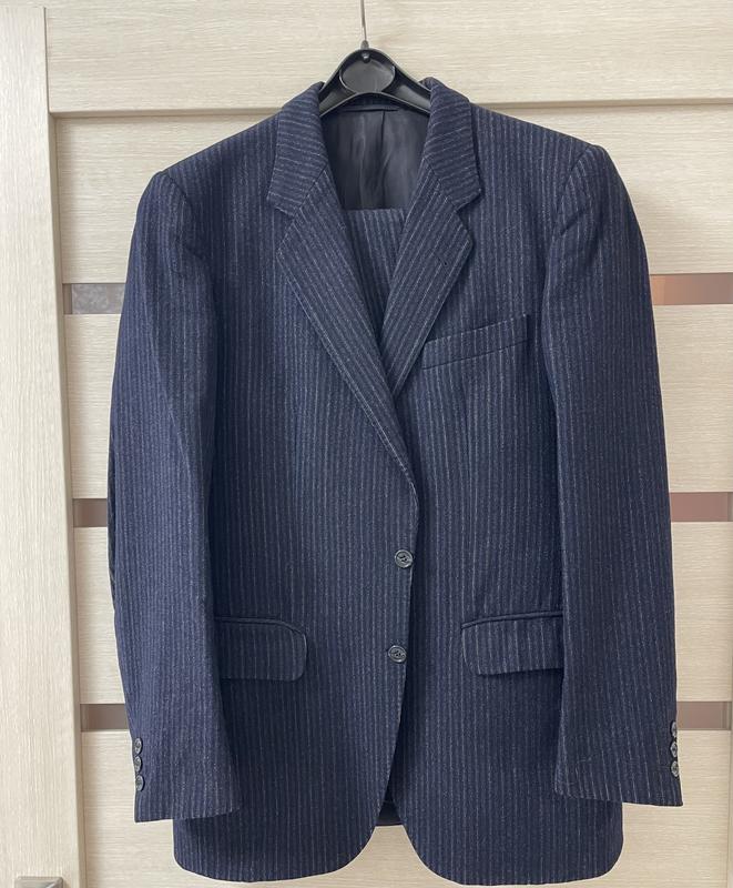 Чоловічий темно-синій костюм у смужку в хорошому стані. Розміри піджака: НО грудей-55 см. Довжина рукава-62 см. Довжина виробу-75 см. Розміри брюк: НО таліі-45 см. Довжина штанів-100 см.