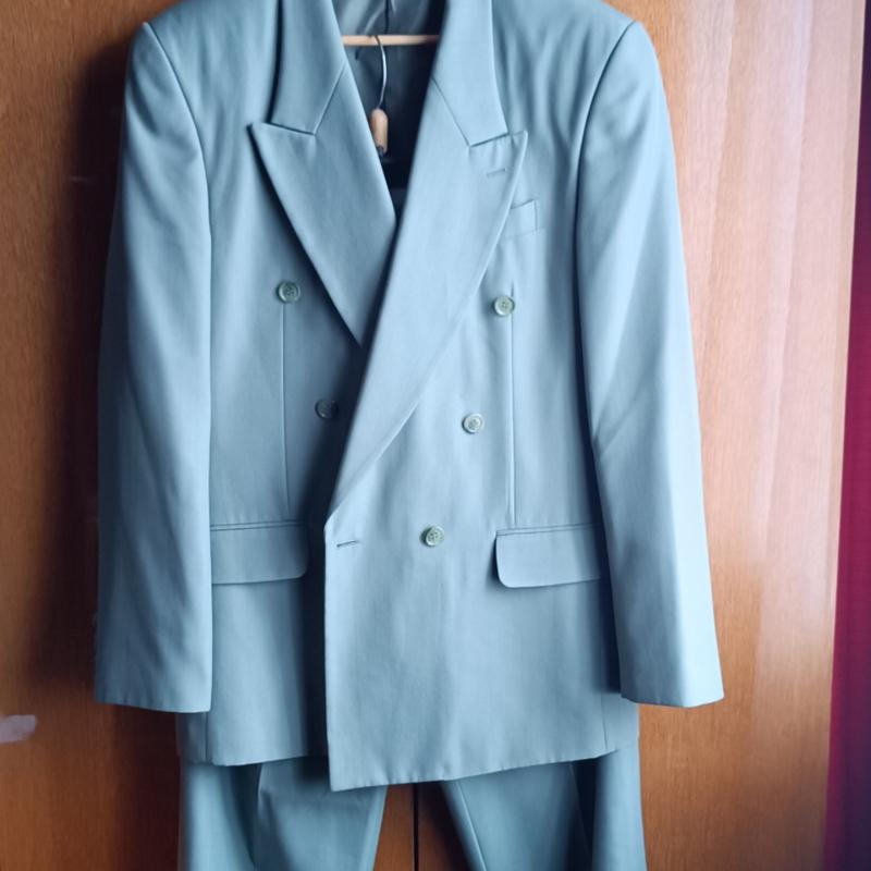 Мужской деловой двубортный костюм сероватого цвета в идеальном состоянии, без дефектов. Цвет в идеале, как на пятом фото. Брюки - классический крой, низ - манжет. В талии - 40, длина - 110, посадка перед - 37, ширина по низу - 22, ширина манжета - 3 см.На брюках сзади один карман на пуговице, спереди - 2 боковых прорезных кармана, крой свободный, от талии по две складки с обеих сторон. Пиджак: ширина сзади в плечах - 48, длина от воротника по центру спины - 78, ширина по низу - 54, ПОТ - 51, длина рукава от плеча - 65 см. Состав - 100% полиэстер. Имеет 3 кармана на лицевой стороне и 3 внутри.