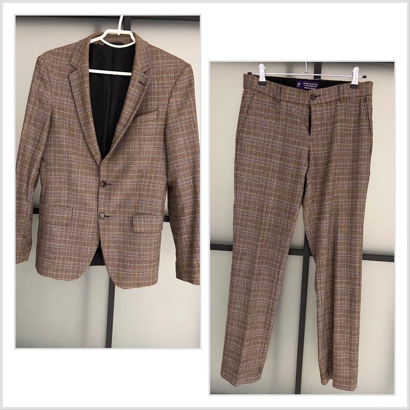Склад: 55% Лавсан, 40% шерсть, 5% Лікра Заміри, піджак: Довжина -70, Плечі - 44 Рукав -64. Заміри, брюки: Талія - 40 Довжина - 98