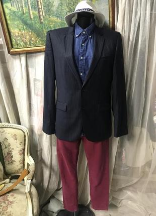 Шикарный пиджак из тонкой шерсти от Hugo Boss. Темно-синий в тоненькую светлую полоску, подкладка чёрная брендированнная. Состав шерсть-100/. Качество! По бирке размер 46, по факту идёт на S/M. Замеры по запросу. Состояние идеальнейшее!