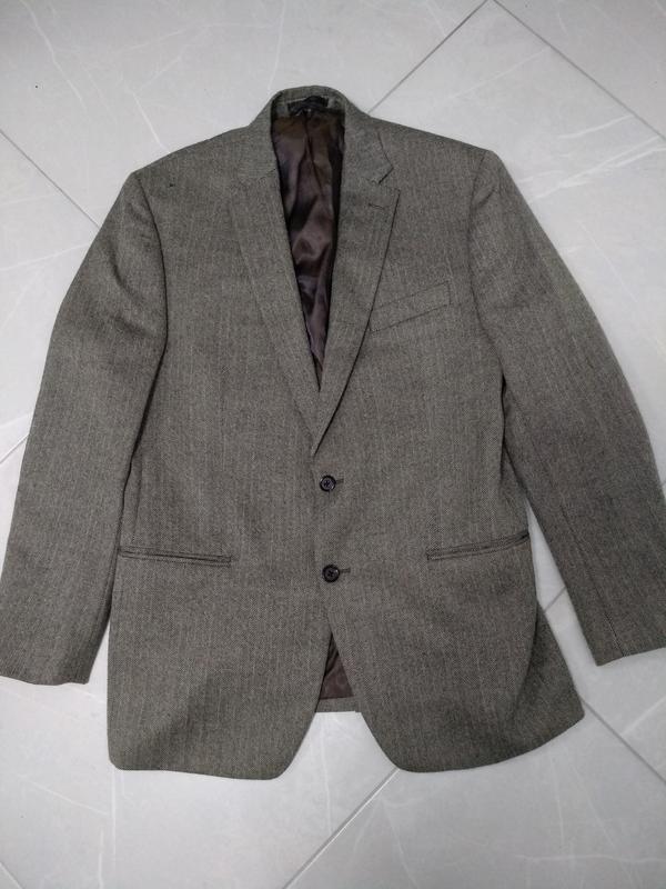 піджак жакет пів'обєм в грудях 56 см пів'обєм в талії 52 см ширина в плечах 47 см довжина 79 см довжина рукава 64 см Привезли з США Не підійшов сину по розміру Має недолік невеличка протертість верхнього шару нитки останнє фото 100 % шерсть
