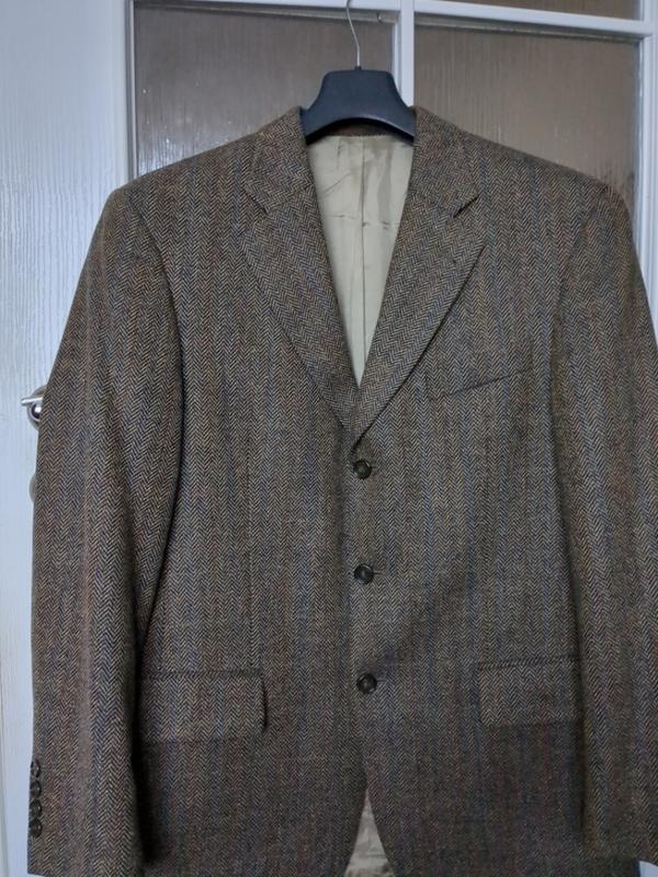 благородного светло-коричневого цвета верх из шерсти, что указано на изделии. ткань в ёлочку, очень интересно смотрится. фасон классический, строгий. сзади нет разреза. пиджак новый, карманы не расшиты. размер указан 48, замеры см. плечи 48, подмышки 56, длина по спинке 76, рукав от плеча 62.