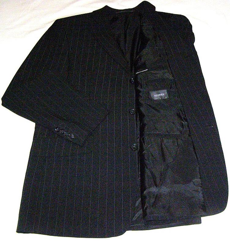 Піджак зі щільної тканини, чорного кольору в тонку смугу, поліестер + віскоза, розмір — 50, імпортний. Довжина рукава — 64 см. Обсяг грудей — 116 см. Обсяг талії — 108 см. Спина — 80 см. Шліц — 1 шт.