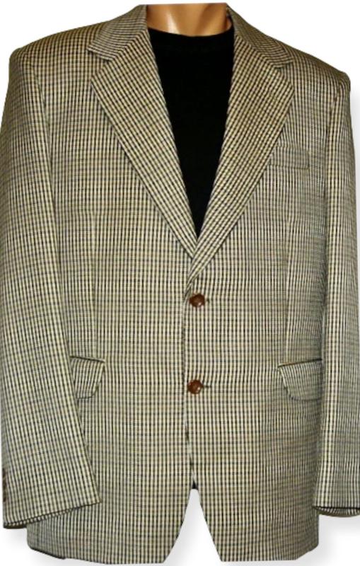 Пиджак Topman, из плотной ткани в мелкую клетку коричневого цвета, 100% шерсть, размер 52-54, импортный- Англия. Длина рукава-66 см, талия- 112 см, объем груди- 122 см., длина спины- 80 см. Шлиц- нет.