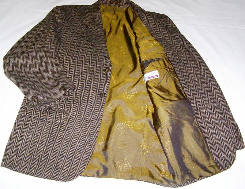 Пиджак "INVOICE" пошит из плотной структурной ткани коричнево-черного цвета в елочку, 70% шерсть+ 30% полиэстэр, размер 50-52, импортный. Длина рукава-63 см. Талия-104 см. Объем груди-114 см. Длина по спине- 77 см. Шлиц- нет.