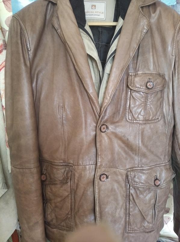 Пиджак из натуральной кожи, очень хорошее состояние, на пуговицах.,подкладка полиэстер. Карманы накладные с клапанами на пуговицах, налокотники, внутренние карманы. Мягкая кожа, цвет светло-коричневый. Размер 48, Пог 58-59, рукав -66, длинна 73см.