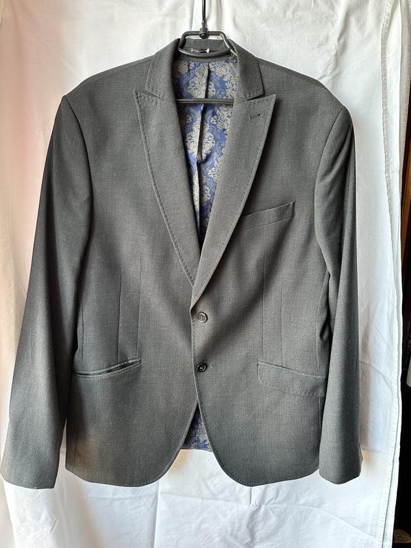 Пиджак очень качественный, легкий, есть внутренние карманы и внешние. Качественно прошитый, почти не носили его. Цвет темно серый. Размер пишет 54, но по замерам выхода Л, полу обхват по груди 60 см, плечи -50, рукав - 68.