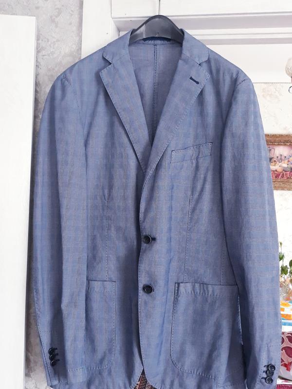 Літній піджак без підкладу.Передні полоси закруглені і до половини мають підклад. Дві внутрішні кишені,декоративний шов. Колір голубовато сірий в клітку мілку. Ефект вінтаж. В плечах 47см,довжина 78см,рукав 68см.