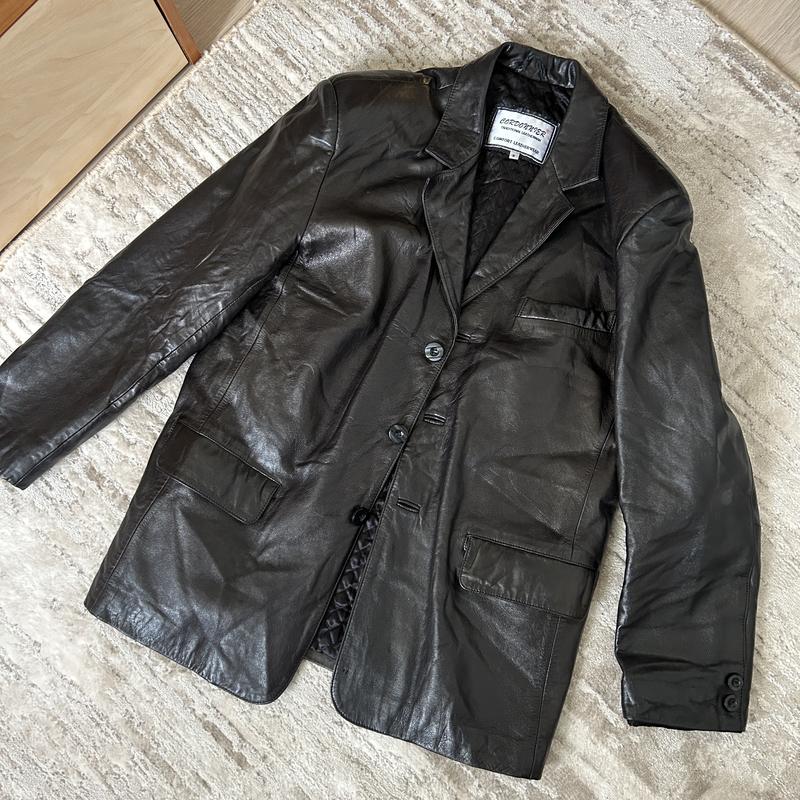 Черный кожаный пиджак Длина 71 Длина рукава 60 Ширина 53 Между плечами 50 Нюанс сзади на фото есть