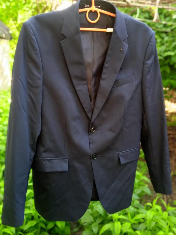 Мужской пиджак ZARA цвет тёмно-синий, в зависимости от освещения на фото показывает темнее или светлее ткань костюмная гладкая современная модель, деловой стиль размер по меркам XL-2XL длина 74 длина рукавов 67 по плечам 50 подмышками 58 см состав вискоза 55% - полиэстер 42% и 3% эластан Состояние отличное