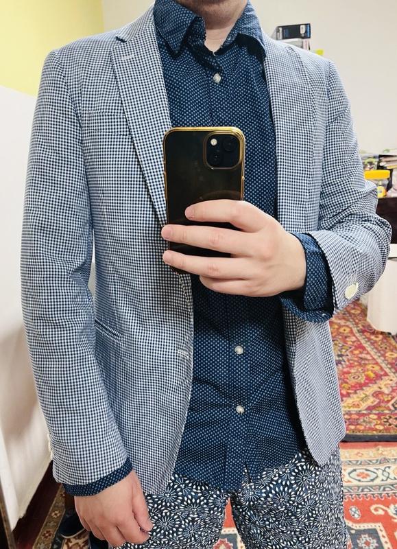 Пиджак мужской в клетку маленькую. Очень стильный и удобный. Фирма Arber. Размер:176/96/84 Модель : Шуберт Замеры на последнем фото. Состав: 80% полиэстер; 18% вискоза 2% еластан. Подкладка состава полиэстер.