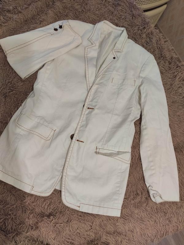 Мужской пиджак, молочного цвета. В отличном состоянии, без недостатков. Есть внутри 3 кармана, и снаружи 3. Так же есть наплечники, под подкладкой. Размер: S