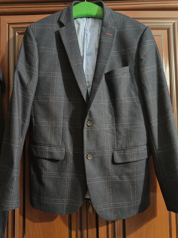 Пиджак с застежкой на две пуговицы из итальянской шерстяной ткани . У пиджака узкие лацканы с декоративной петлицей на одном. Нагрудный карман и передние карманы с клапанами. Сзади шлица. Снизу на рукавах декоративные пуговицы. Три потайных кармана, из которых один - на пуговице. На подкладке. Состав:75%шерсть,25%полиамиды.ПОГ55см,плечи 48см,плечо 15см,длина рукава 67см,длина 74см,ПОТ52см.Смотрите по замерам.