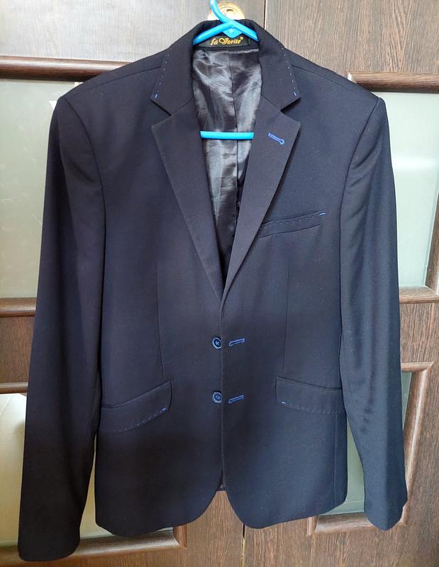 Пиджак темно-синий на подростка, паруска, на рост 170-180см. Пошит из качественной ткани: 70% Шерсть, 30% вискоза с полиэстером. Модный, стильный, в красивом состоянии, ткань и форма без изменений. Длина 72см, Ширина по плечах 42см, Длина рукава 63см