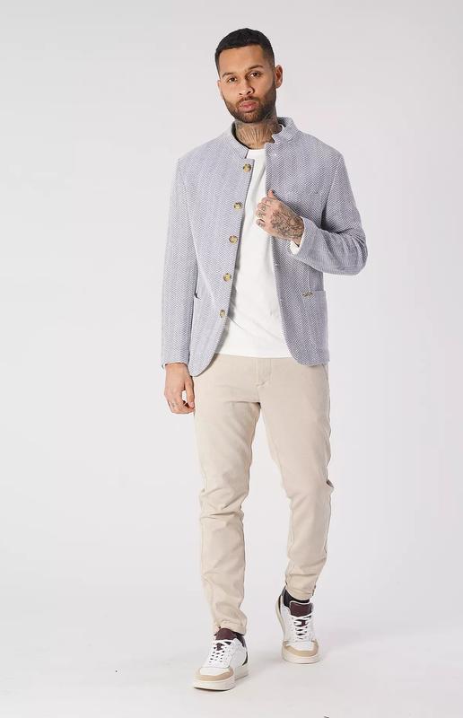 Чоловічий блейзер жакет з трикотажу Комір-стійка Довгий рукав Три накладних кишені Комфортний бавовняний трикотаж з ексклюзивним візерунком у ялинку. Ґудзики зі справжнього горіха корозо Прямий крій Матеріал: 100% бавовна Стан ідеальний. Розмір вказано 56 але в реалі підійде на менший орієнтуйтеся на заміри. довжина ОГ плечі рукав