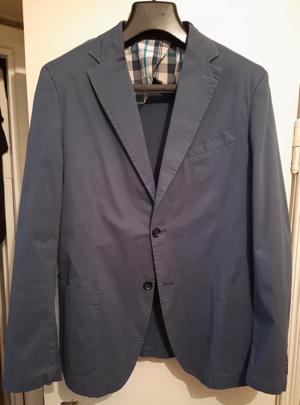 Пиджак коттоновый синего цвета для повседневного применения. Пиджак без подкладки с двумя накладными карманами.