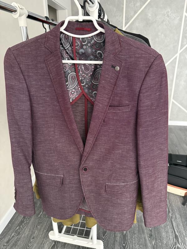 Мужской жакет в бордовом цвете. Стильный мужской жакет в трендовом цвете бордо – идеальный выбор для деловых встреч и особых событий. Качественная хлопковая ткань турецкого производителя. Характеристики: ✔️ Застегивается на одну пуговицу, прямой крой ✔️ Ткань дышащая с приятной текстурой ✔️ Подкладка из качественного материала ✔️ Классический отложной воротник ✔️ Внутренние и внешние карманы Жакет отлично сочетается как с классическими брюками, так и с джинсами. Состояние отличное! Подойдет на размер S или на подростка. Заміри на фото.