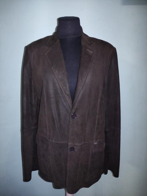 Натуральная кожа, очень мягкая (нубук), бархатистая, приятная на ощупь. На подкладке. Коричневого ровного цвета (камера дает блики). На полочках -накладные карманы с клапаном. На спинке по рельефам снизу-шлицы. Длина по спинке-76, плечо-15, рукав-69.5, ширина плеч-49, Пог-59, Поб-57. Очень стильная, элегантная вещь. Смотрите еще свои объемы, есть много интересных вещей.