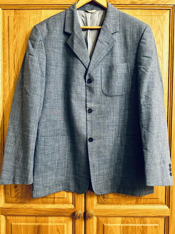 Чоловічий піджак. Сіро-блакитний, з легкого матеріалу (льон/бавовна). Стан чудовий. Легкий та комфортний в теплу пору року. Заміри: півобхват плечей - 47 см.; півобхват талії- 53 см; довжина рукава - 65 см; довжина - 78 см. Три кишені.