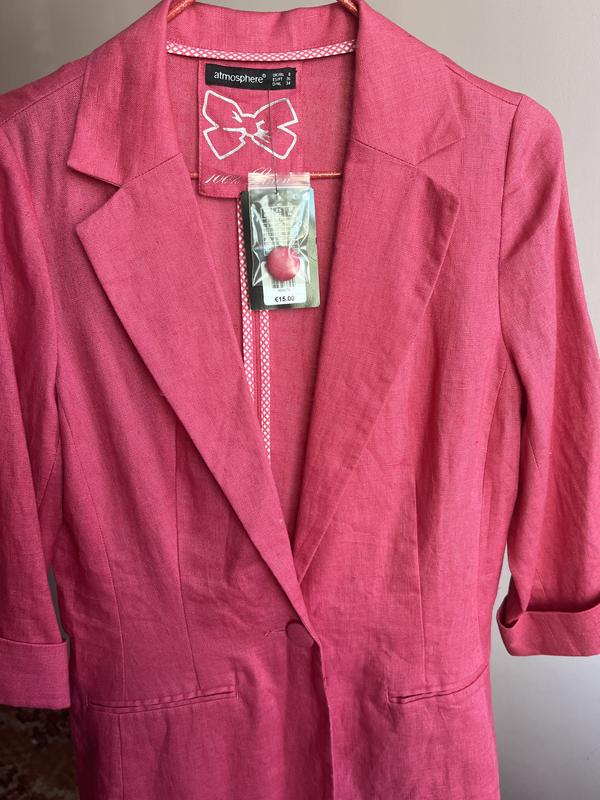 Новий 100% льняний піджак на один ґудзик Вказано р.8/36 Ідеальний на S-ку Заміри: Довжина 67-68 см ПОГ 45 см ПОБ 59 см Рукав 3/4 - довжина 42 см, підворот 5 см Плечі 36 см Всі заміри зроблені по спинці!