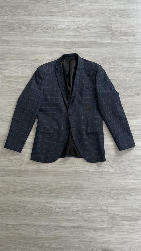 Колір - сіний navy blue, біла клітинка у візерунку windowpane Виміри: Плечі 47 Груди 53 Талія 50 Рукав 64,5 Довжина по спині 76 Стан прекрасний, носив рідко - на заходи та презентації. На жаль я збільшився, тому розмір мені замалий (купив аналогічний 52) Можна купити як костюм за 1100 - дивіться мої оголошення. Без торгу.