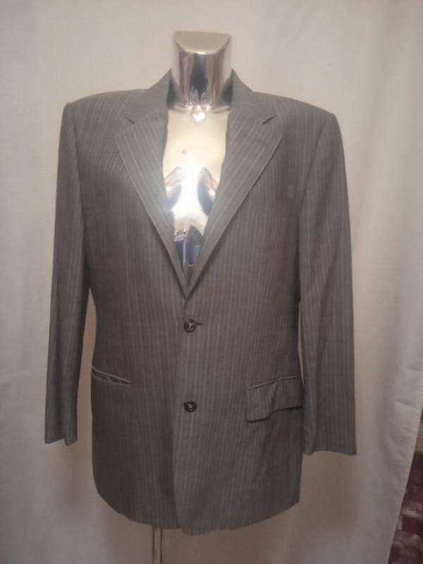 Мужской классический пиджак от hugo boss серого цвета в голубую полоску.