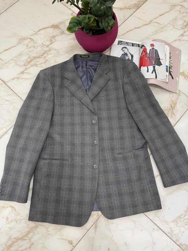 Чоловічий піджак у розмірі 52. Стан - ідеальний(одягнений 1 раз). Склад: 70% шерсть, 15% віскоза, 15% поліестер.