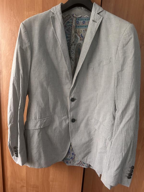 Дуже дякую дачний та стильний піджак дорогого люксового бренду Etro. У синьо-білу смужку, зверху бавовна, підкладка змішаний склад шовк, візкова, ацетат. Розмір ніби M, можливо на L. На комірці є трішки сліди(видно на фото). Можливий торг.