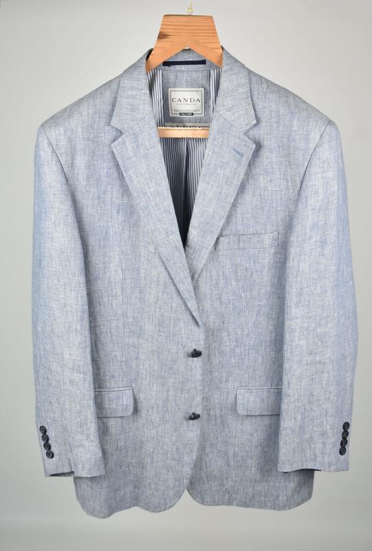 Мужской летний льняной голубой пиджак Canda Состояние новой вещи. Размер L-XL. Материал - лен Замеры: Полная длина по спине - 79 см Плечи - 48 см Груди - 60 см Длина рукава - 61 см Ширина манжети рукава - 14,5 см