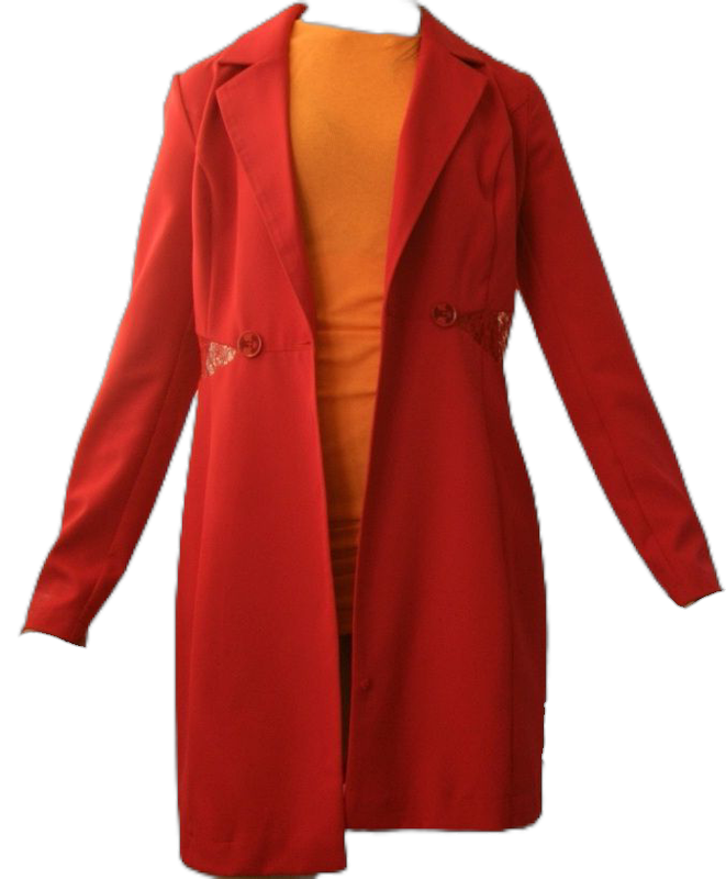Яркий красный длинный пиджак / пальто с приталенным силуэтом. Имеет две декоративные застежки на уровне талии и кружевные вставки по бокам. Идеальный вариант для весны или осени. Хорошо сочетается с джинсами, платьем или классическими брюками. Состояние очень доброе