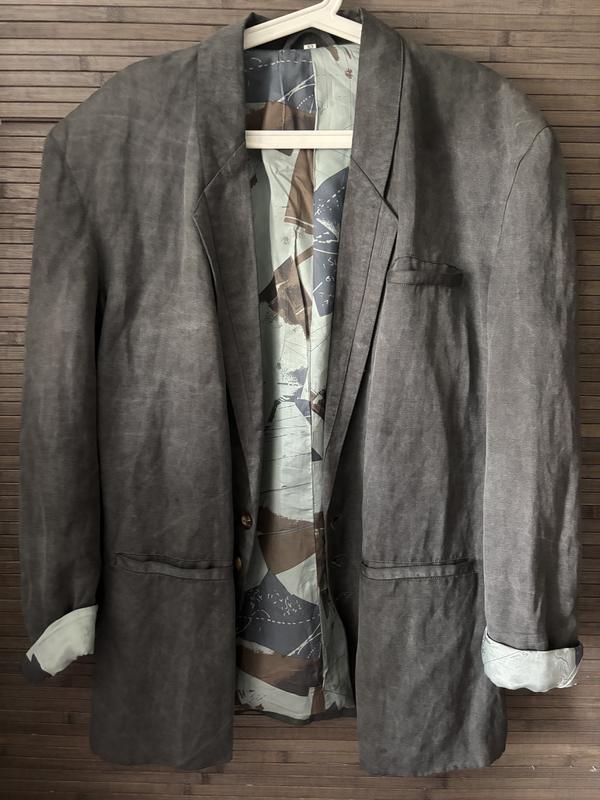 Дизайнерський стильний піджак з льону, яскравою підкладкою та мʼякими підплечиками. Можна як чоловічий так і жіночий, стиль дозволяє. Стан ідеальний, практично новий, кишені не розшиті. Пог 59, плечі 55, рукав 66, довжина 79, по низу 58.