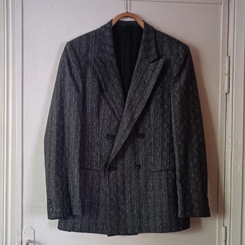 Пиджак мужской двубортный на 2 пуговицы. Размер 46-48. Состав: 45-шерсть, 55-полиэстер; подклад 100% вискоза. Имеет внешние карманы, 4 внутренних. Сзади внизу разрезы. Длина -78, рукав - 65, плечи - 46, ПОГ-53, ПОТ-50, полуширина внизу - 55