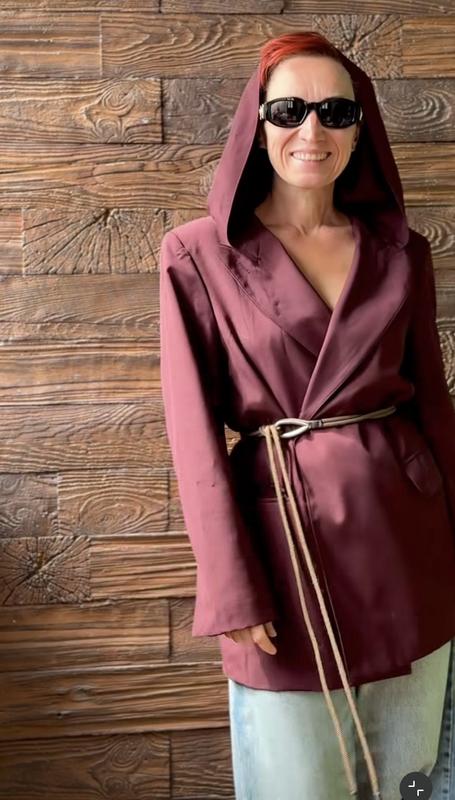 Жакет незвичного крою, де паралельно, як і класичний так і спортивний стилі. Крій прямий, двобортний, з глибоким капюшоном, на підкладці, колір буряковий Розмір S-L В грудях 106, В плечах 45, довжина 74, рукав 60 Склад віскоза 50%, підкладка ацетат