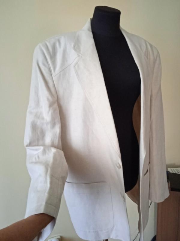 Размер указан 25. Длина 78 см. Плечи 48 см. Рукава 64 см. Полуобъем груди 58 см. Есть карманы и снаружи и внутри. Подкладка есть. 55% льна. Дефектов нет. Ткань достаточно плотная. Цвет светлый бежевый.