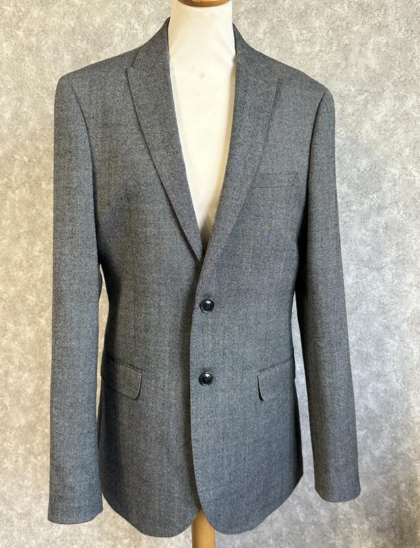 Чоловічий піджак відомого бренду,новий,але без етикетки(ще навіть зашиті кармани).Виробник В*єтнам,склад тканини:50% шерсть+48%поліестер+2%еластан.Розмір вказано eur 48,реальні заміри: довжина по спині 75см, плечі 45см, плечовий шов 14см, довжина рукава від плеча 67см, ширина під рукавами (по спині) 57см, ширина (по верхньому гудзику) 45см. Піджак відмінної якості,підійде на всі випадки життя,на свято,на роботу.