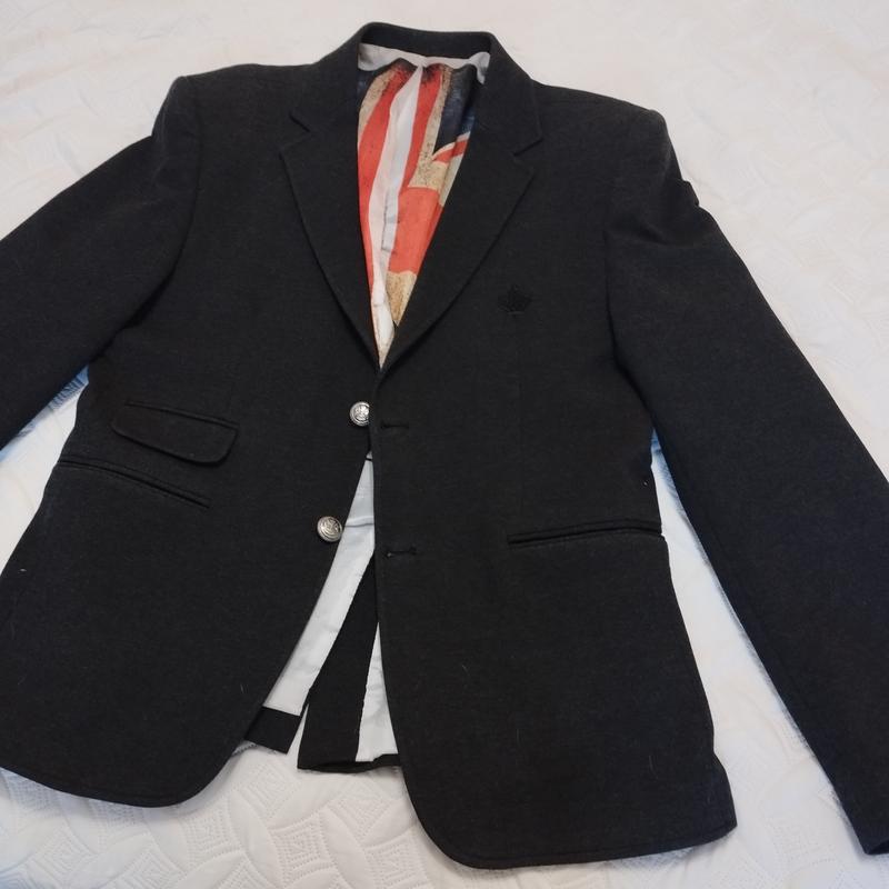 Пиджак мужской серый цвет, есть следы ношения, недостатки сфотографированы. Длина 71 Плечи 47.5 Длина рукава 66 Пог 52 Пот 49 Поб 50