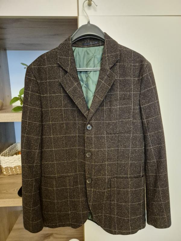 Мужской пиджак шоколадного цвета в крупную клетку в хорошем состоянии, одевался не часто (став малый размер) Длина рукава 62см Полуобхват 50см