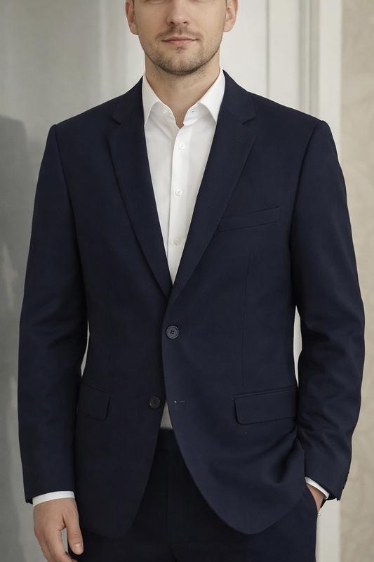 Стан нового Кармани та спина зашити Стильна стрічка на лацканах та кармані Один ґудзик треба пришити краще Темно -синій колір Подовжений. На високій зріст