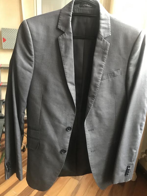 Приталенный ( slim fit) пиджак графитового цвета. Дважды был в химчистке.украинский производитель, ткань 65% полиэстер+35% вискоза с отделочной отстрочкой бортов и подкладки.Сзади две шлицы по бокам, по типу «клубный пиджак», что ещё больше подчеркивает силуэт. Размер на этикетке 176/88/76. Длина плеча-16,5 см, длина рукава-65 см,ширина спины по подмышкам-51 см, длина по спине-73 см. Можно скомплектовать костюм с брюками ( в следующем листинге), практически тон в тон, покупались вместе как костюм.